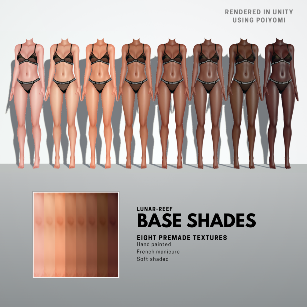 Base textures including 8 skin tones, normal map, roughness map, AO map and thickness map.