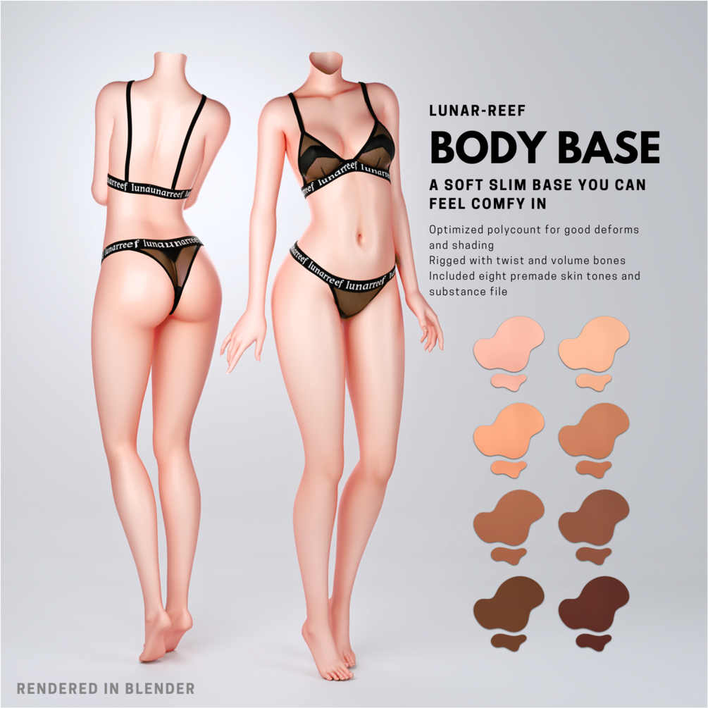Body base for VRChat! Base is subdiv modeled, rigged and textured by me from scratch, work in progress pictures can be found on my discord.